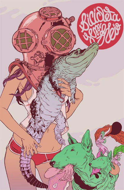 Douglas Bicicleta is evidently a huge fan of playfully using colors, comic book styling and women. Seeing as how a large portion of his artwork revolves around cowgirls, tattooed girls and rebel chicks all in various states of undress, this is one modern way of bringing back the pin-up girl in a new light.